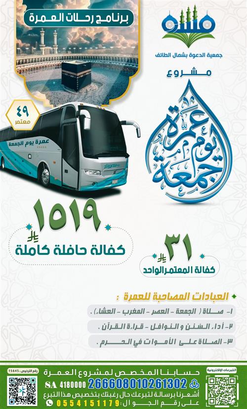 بمساهمتك في مشروع عمرة الجمعة تنال اجر: 1- أداء العمرة 2- أداء صلاة الجمعة بالمسجد الحرام 3- أداء صلاة العصر بالمسجد الحرام 4- أداء صلاة المغرب بالمسجد الحرام 5- أداء صلاة العشاء بالمسجد الحرام